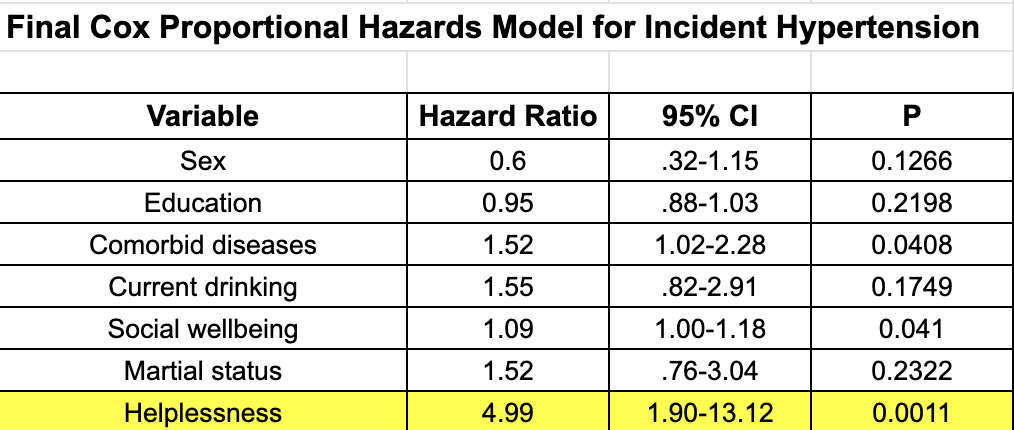 - Stephen L. Stern, M.D., Rahuld Dhanda, Ph.d., and Helen P. Hazuda, Pd.D. Helplessness Predicts the Development of Hypertension in Older Mexican and Europrean Americans. J Psychosom Res. 2009 Oct; 67(4): 333-337.